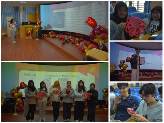 “中国元素符号绘画接龙”将气氛推向高潮。围绕“龙”“灯笼”“熊猫”“长城”等典型意象,同学们分组执笔、接力创作,在协作中勾勒出一幅幅充满趣味与创意的文化画卷。剪纸体验环节则让众人亲手剪制“春”、“福”与梅花纹样。红纸翻飞之间,虽手法生疏,却每一剪都承载着真挚的祝福,浓浓的年味与情谊在现场缓缓流淌。